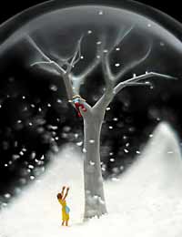 Американо-испанская пара художников Уолтер Мартин и Палома Муньос (Walter Martin and Paloma Munoz) из Нью-Йорка исследуют маленькие драмы из повседневной сумасшедшей жизни и трансформируют их в коротких сценках. Сюжеты их работ всегда происходят на фоне заснеженных пейзажей, но удивительно даже не это. Самым необычным является то, что герои герои Уолтера и Паломы живут в закрытом пространстве: внутри снежных шаров. Большинство шаров, имеющих около 15 см в диаметре, изображают фигуры людей, одиноких или находящихся во власти других, изгнанных в снежные пейзажи и одетых не в соответствии с холодной погодой. После того как авторы договариваются об идее и создают миниатюрные декорации, они помещают их внутрь шаров – технология, постигнутая путем множества проб и ошибок. Вначале художники переворачивают снежный шар и наполняют его, словно круглый аквариум, смесью воды и спирта. Затем они прикрепляют уплотнение к нижней части пейзажа и помещают конструкцию в середину стеклянной сферы, вытесняя избыток воды и избавляясь от пузырьков воздуха.