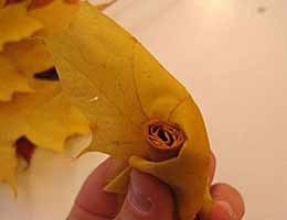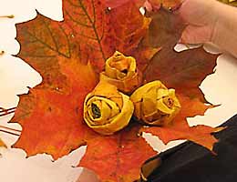 Для красивого букета роз из кленовых листьев нам понадобятся большие и свежие листочки клена, и лучше разного цвета.Приготовьте также нитки, а для того, чтобы розочки простояли дольше нужно смазать их растительным маслом. Через пару дней масло впитается и сделает листья мягкими, предотвращая засыхание. На фотографиях ниже последовательно показано, как сделать кленовые розы.