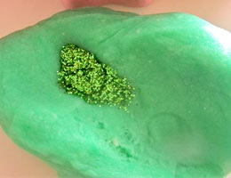 Должно получиться мягкое, эластичное светлое тесто, которое не липнет к рукам. Можно еще добавить блесток в некоторые куски, хорошо их смешав с пластилином.Вот и все! Все просто и быстро!